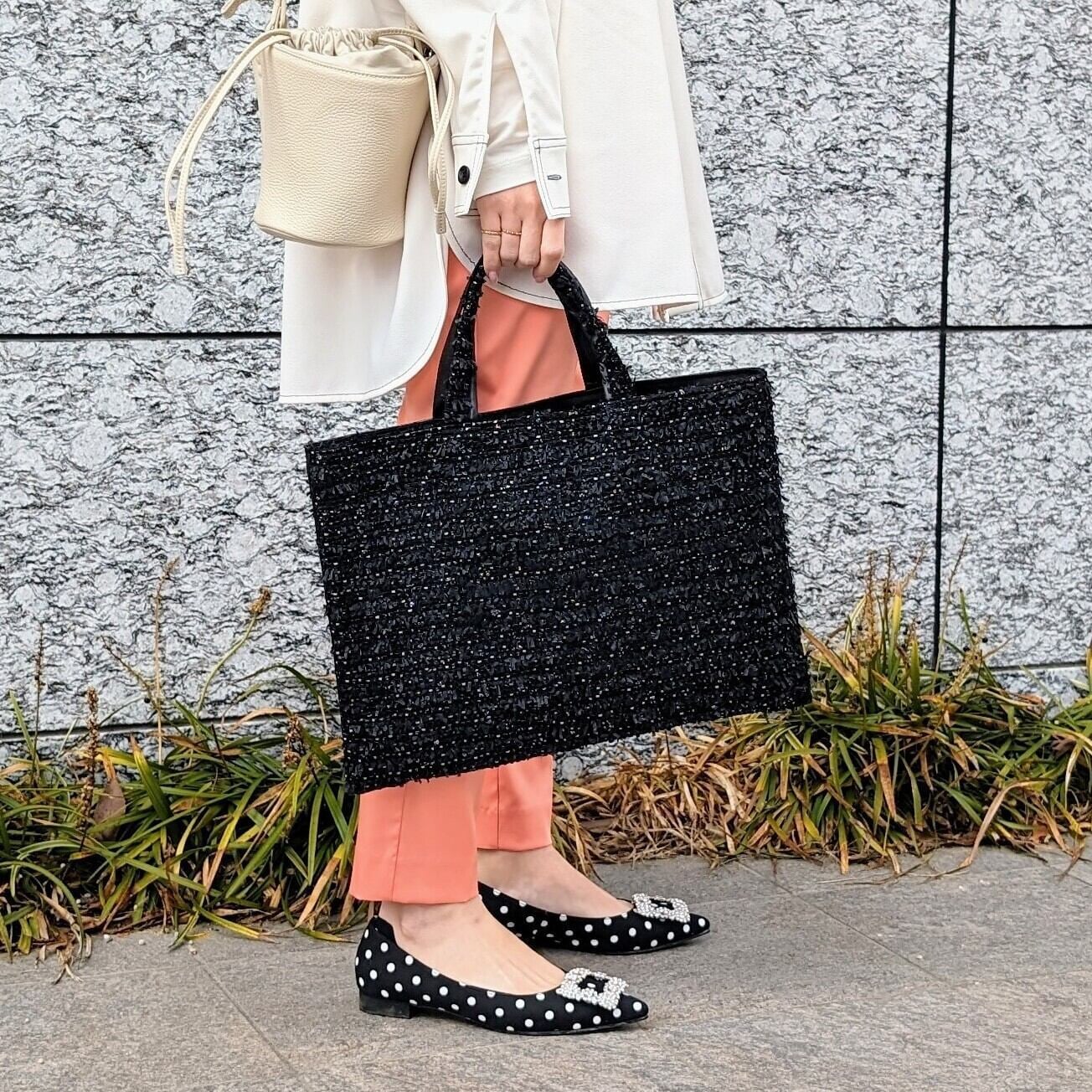フェザーのようなモケモケ糸と動く度にキラッと光る糸が織り重なり、とてもエレガントで美しいツイード生地です。サブバッグとしてコーデやメインバッグの邪魔をしないので、普段使いはもちろん、オケージョンシーンでも大人気のツイードバッグです。