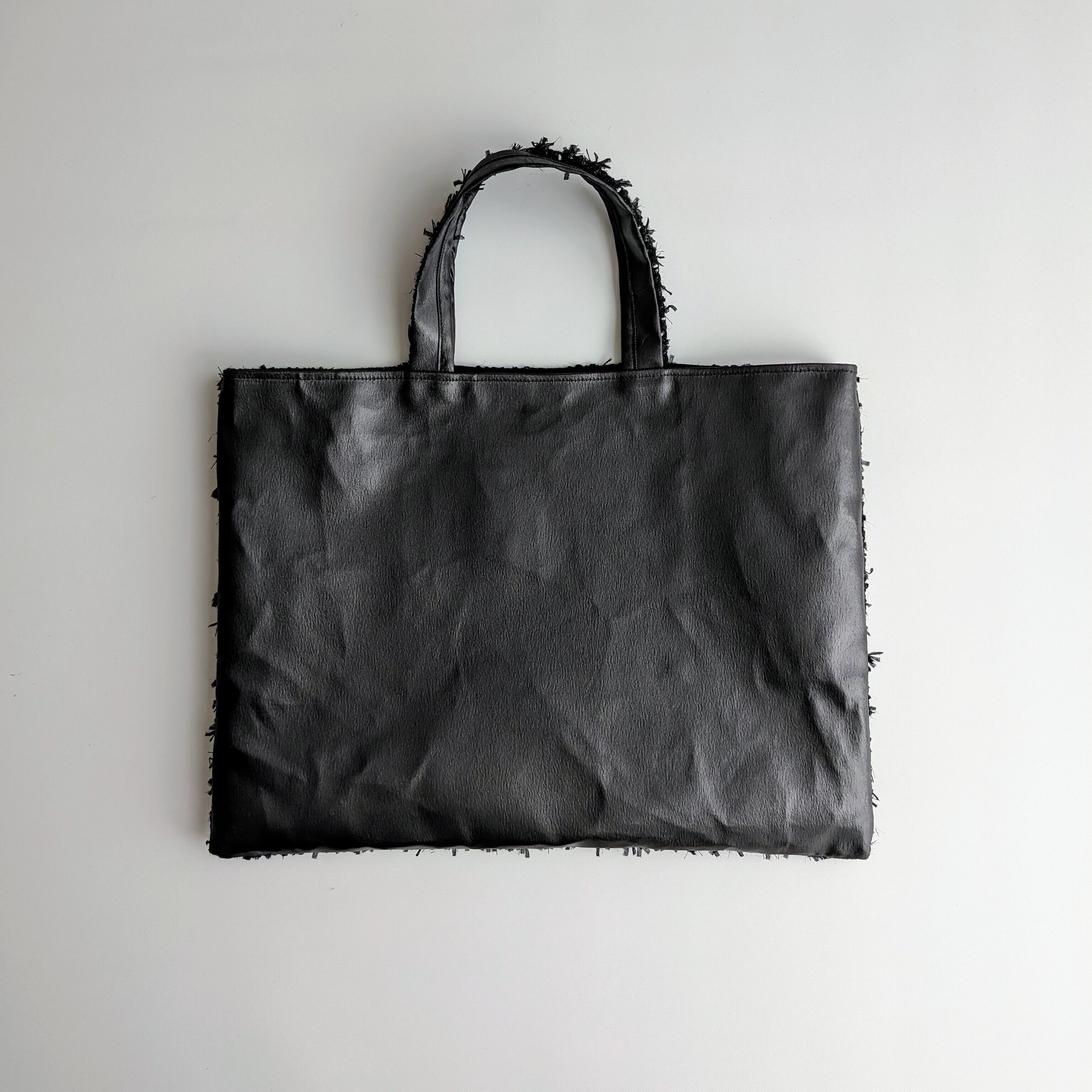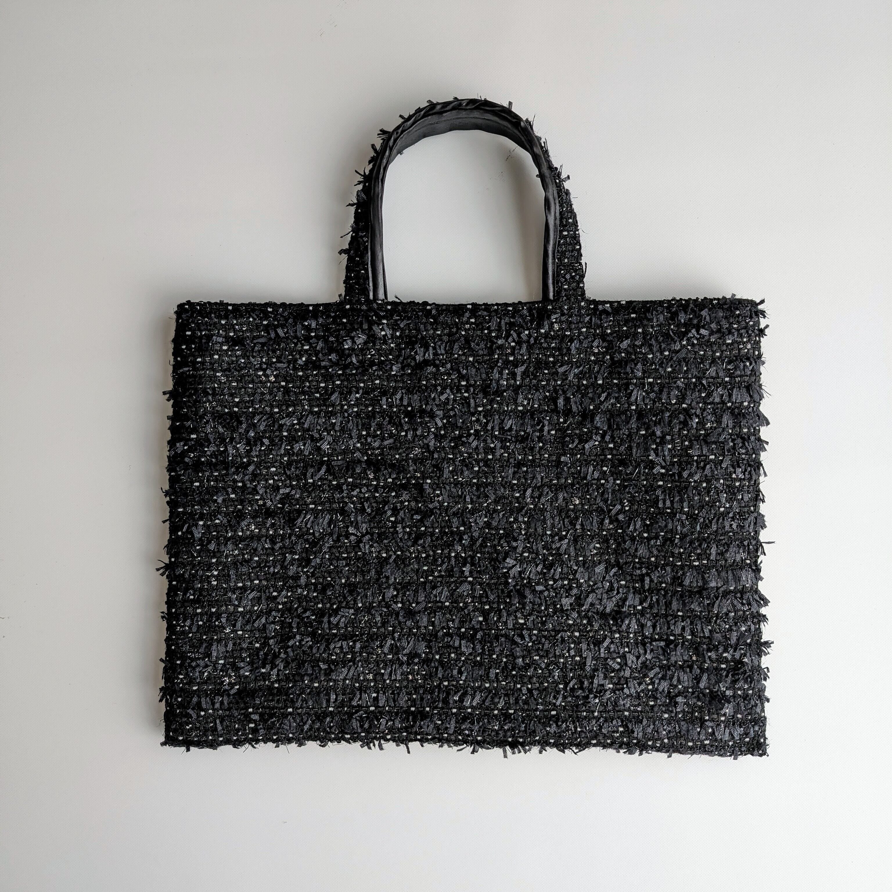 ・製作過程で生地を四方に引っ張りながらプレスして接着芯を貼り、強度を持たせております。その為、格子状のデザインが歪んだ状態でバッグとして仕上がっているものもございますが、繊細なツイードの特性上、ご了承くださいませ。